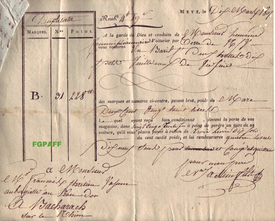 | Bacharach, 22 ten März 1807 Herrn adam Stein in Metz Dero Briefe vom 10. und 21. Merz, so wie das Fäßchen Brandwein ist mir durch ? Dietz & Zweiffel in Coblenz, welches Ihnen von Herrn P. Lemoine in Metz für meine Rechnung zugekommen ware (Ware). zu recht erhalten. Als ich das Fäßchen empfing, sahe ich daß die emballage naß war und der Brandwein im Fäßche sehr schwapte. Ich erschrak sehr, nahm zwey Zeugen und öffnete es in Ihrer Gegenwart wo sich fand daß das Fäßche durch (Kartusche?) Korkasche den jemand vom Fuge genommen hat und schon mit Macklatur Pappier, welches nach dem Bericht des H ? Dietz & Zweiffel in Coblenz geschehn, gestopft ware. Ich glaubte, es würde Viel fehlen, allein es fand sich daß zum Glück nicht mehr ausgelaufen war, als vier Litters. welches an meine Rechnung zu guth zu schreiben bitte. Aus dero werthen vom 21. Merz ersahe ich daß